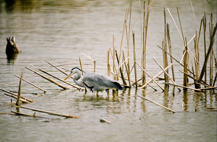 C'est un oiseau appartenant à la famille des hérons qui compte 9 espèces en France. Sa taille est de 85 à 102 cm pour un envergure de 160 à 180 cm et son poids de 600 g à 1 200 g. C'est un grand oiseau dont la tête et le dessous du corps sont de couleur blanche. La tête est également ornée de deux gros sourcils noirs. Le dos et les ailes sont gris...cendré.. Ses pattes et son bec sont de couleur « jaune ». Ce dernier, long et puissant à la manière d'une dague, lui sert à capturer des proies de grosse taille (poissons, batraciens, écrevisses, canetons,...) Nom anglais : Grey Heron / Nom italien : Airone cenerino