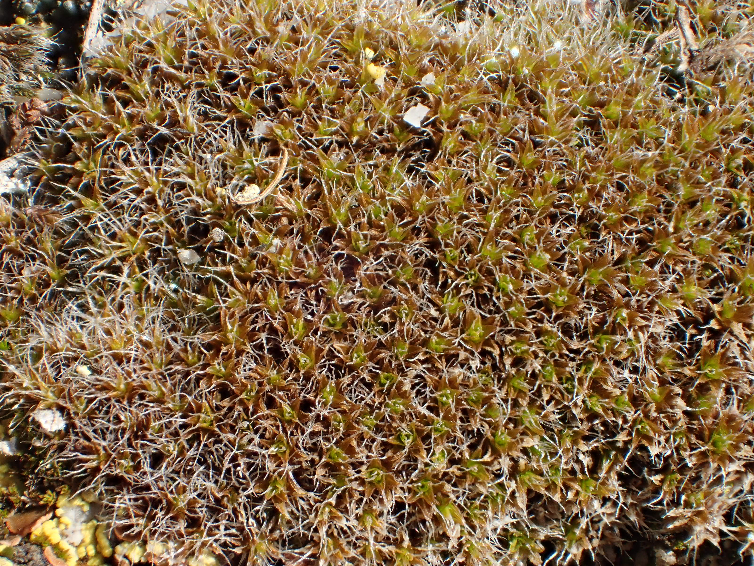 Cette mousse acrocarpe pousse en petits coussinets denses de moins de 2 cm de hauteur, vert olive à brun grisâtre. Sur les plantes sèches, les feuilles sont dressées, imbriquées plus ou moins en hélice et forment une petite houppe au sommet des tiges. Sur les plantes humides, elles sont davantage étalées. Ces feuilles sont ovales, lancéolées, concaves ; la marge entière est récurvée sur toute la bordure. Sur l'apex arrondi émerge la nervure qui se prolonge par un long poil hyalin fortement denté. Le limbe, totalement ou partiellement bistratifié dans la partie distale, est composé de cellules carrées à polygonales, ornées de plusieurs papilles bifurquées. Les cellules dorsales de la nervure sont également fortement papilleuses. Les cellules proximales, rectangulaires, lisses, hyalines, forment un ensemble bien délimité. Les sporophytes sont très rares chez cette espèce dioïque.