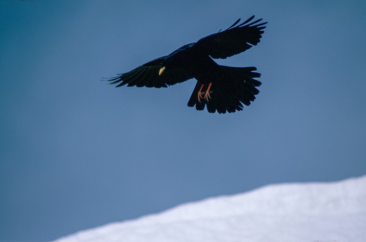 Tout vêtu de noir, ce corvidé au bec jaune exclusivement montagnard vit dans les Alpes, les Pyrénées et les montagnes corses jusqu’aux plus hautes altitudes de l’étage nival. C’est un fabuleux acrobate, qui joue et se joue des courants aériens. Cette aisance en vol lui permet d’explorer les falaises et les escarpements rocheux où il niche, parfois à plus de 3 000 m.