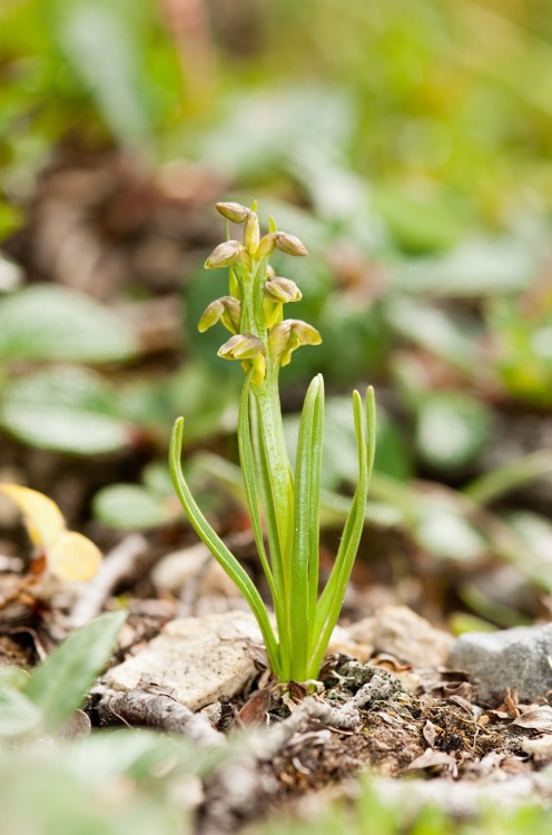 Éminemment discrète, cette petite orchidée n’est pas facile à repérer sans une bonne connaissance de son écologie. Les plantes mesurent moins de 10 cm de haut. Les feuilles toutes basales, linéaires, un peu charnues, ressemblent plus ou moins à bien d’autres "herbes" des pelouses alpines. L’inflorescence, qui apparaît en juillet, est un épi court, peu dense, qui se dresse au centre des feuilles. Cet épi regroupe de trois à dix toutes petites fleurs, verdâtres à jaunâtres, dépourvues d’éperon. La multiplication végétative contribue parfois à la formation de touffes regroupant jusqu’à une dizaine d’inflorescences. Coeloglossum viride possède des fleurs à peine plus grandes et plus colorées, mais des feuilles nettement plus larges, de forme elliptique.