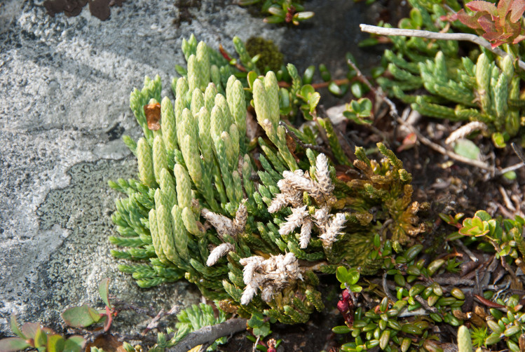 Le Lycopode des Alpes reste très discret dans les landes à éricacées où il pousse habituellement. Une tige rampante sur laquelle se dresse de petits rameaux fins, ramifiés, quadrangulaires, de quelques centimètres de haut et de couleur vert bleuâtre le distingue d’Huperzia selago et de Selaginella selaginoides, autres lycophytes plus communes en Vanoise. Les épis sporangifères, sessiles à l’extrémité des rameaux et en forme de petite massues de 1 à 2 cm de haut, virent au roux à l’automne, et permettent parfois de mieux repérer ce lycopode dans son environnement.